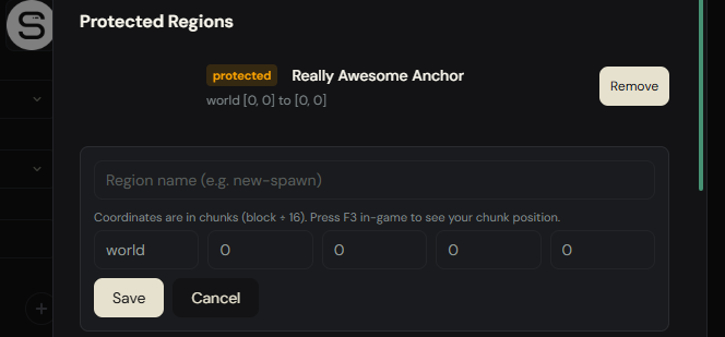 Protected regions prevent that. You define areas on the creative server (in chunk coordinates) that should never be overwritten during a sync. The rest of the world gets updated from survival, but your in-progress builds stay exactly where they are.