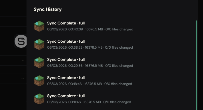Incremental Sync is the smart one. It compares file checksums and only transfers what actually changed since the last sync. If your survival world is 16 GB but only 200 MB of region files changed, that is all it copies. Way faster for regular updates.