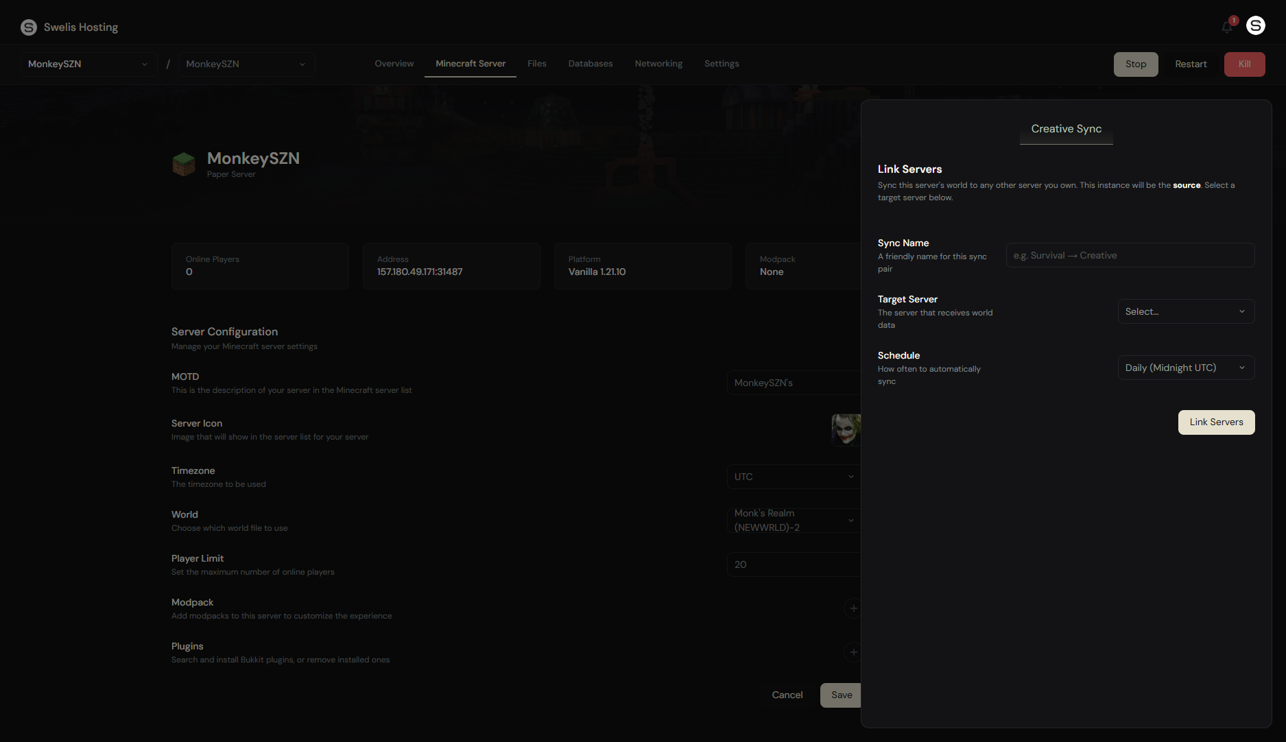 From your dashboard, open the Minecraft tab on the survival server and scroll to Creative Sync. Pick your target creative server, give it a name, and you are done.