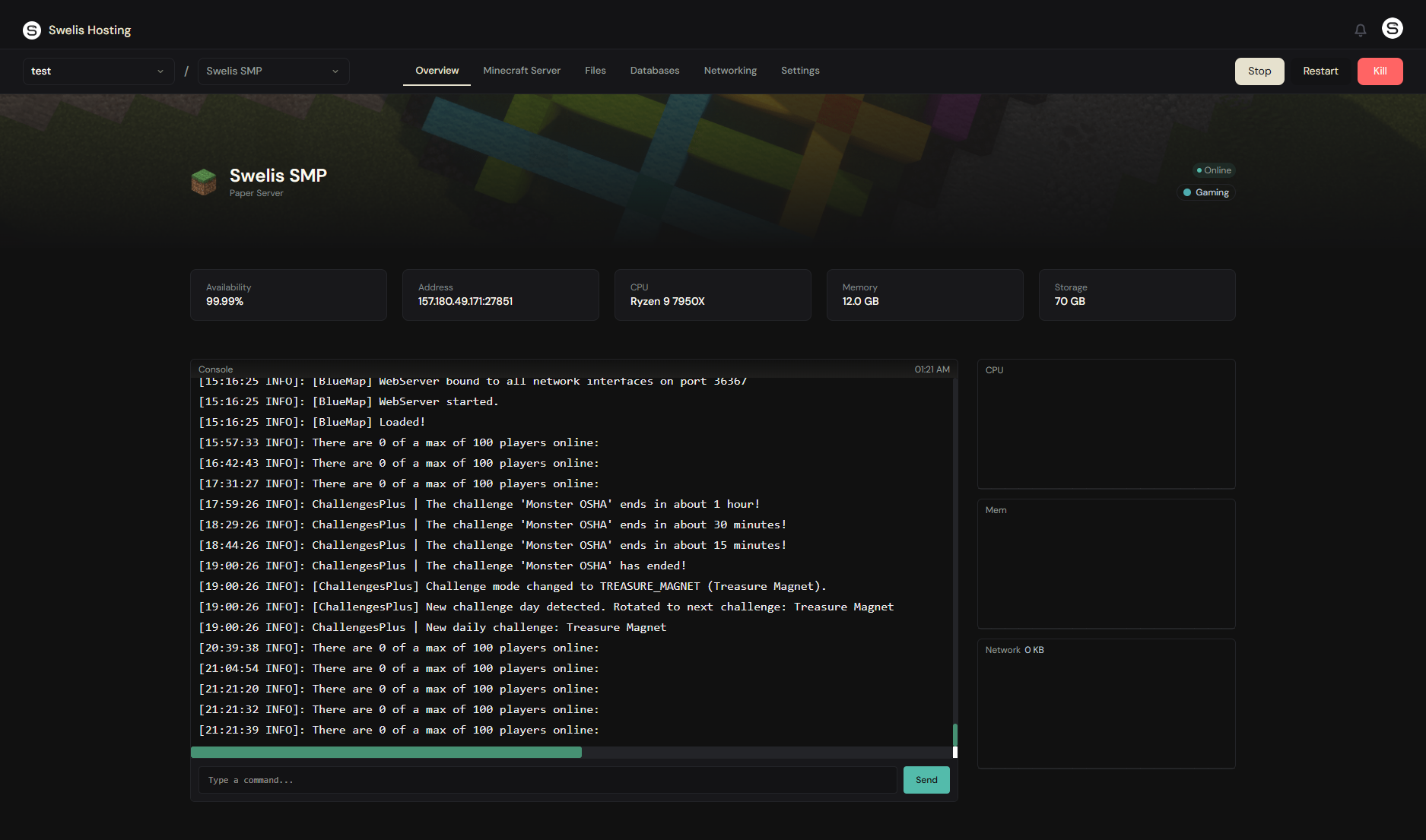Once it is online you will see a live console, file manager, and the full management panel.