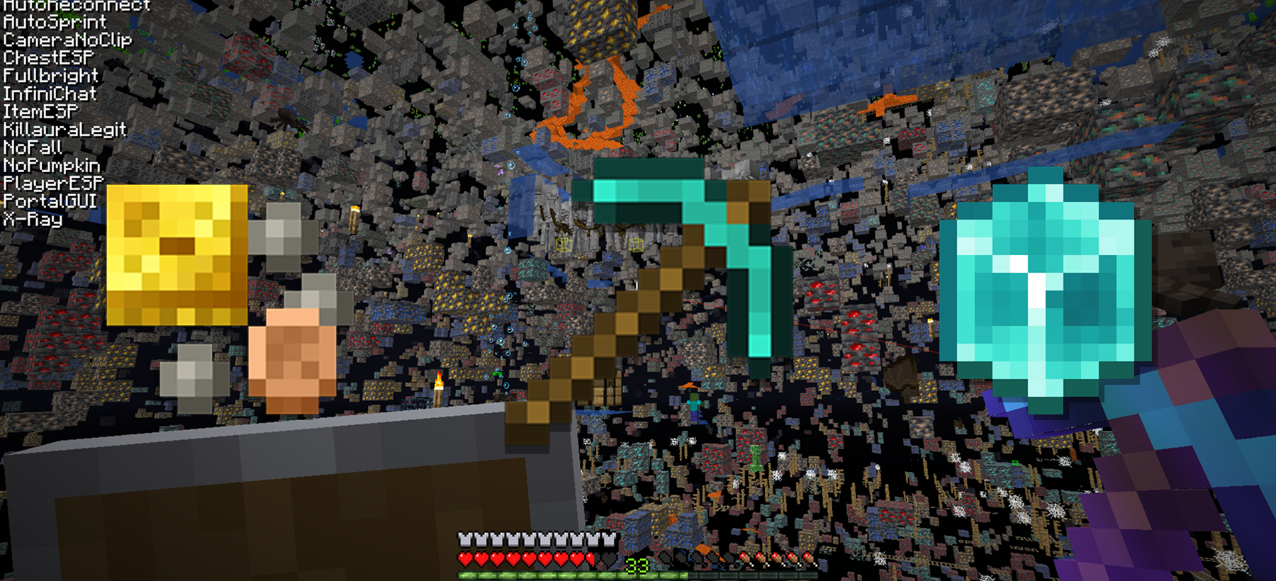 - ESP (seeing players, mobs, or chests through walls)