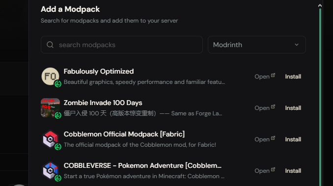 Type the name of any modpack — Better Minecraft, All the Mods, RLCraft, Cobblemon, whatever you are looking for. Results come straight from Modrinth, one of the largest Minecraft mod repositories, so the library is massive.